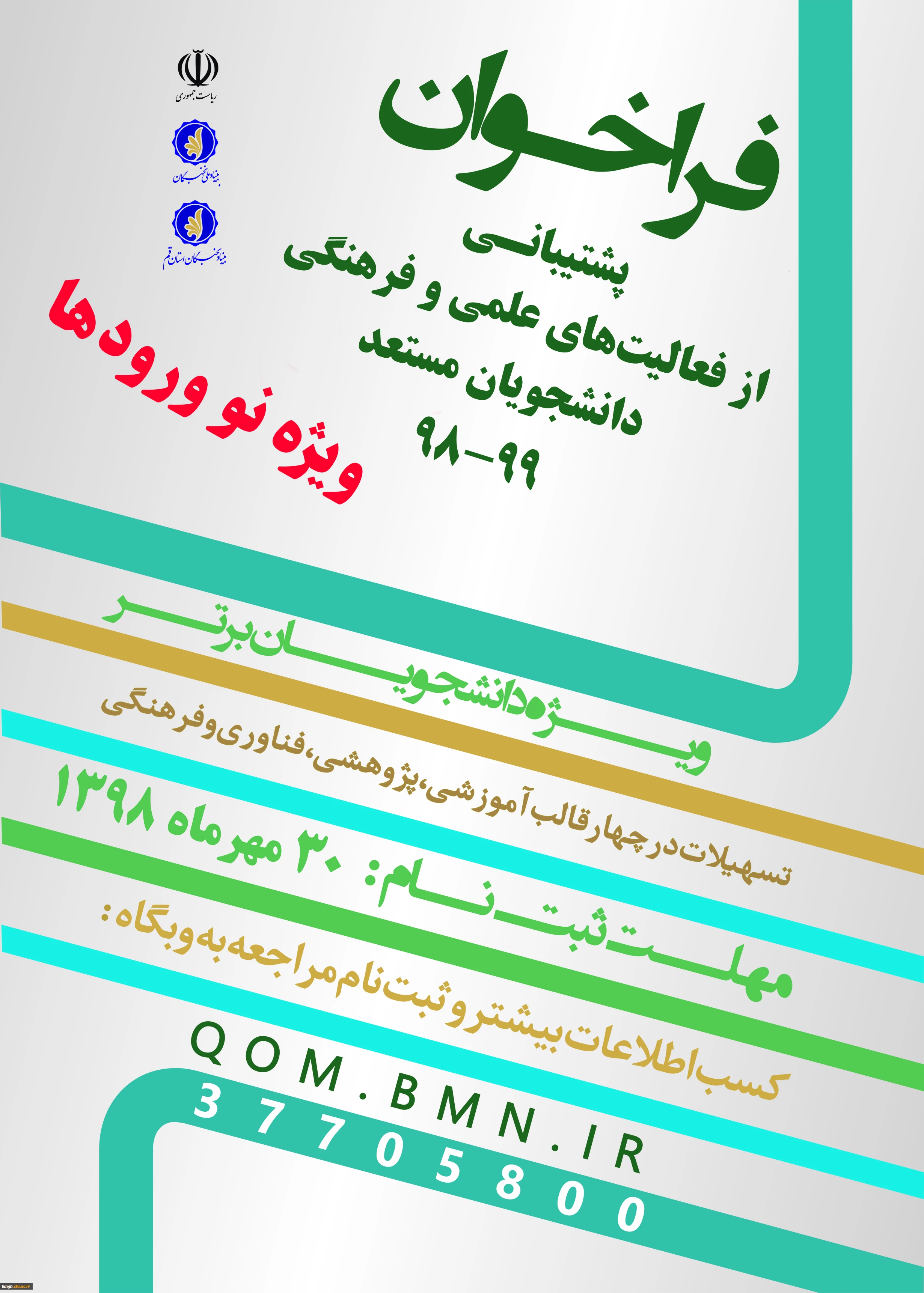 اطلاعیه پشتیبانی بنیاد ملی نخبگان از دانشجویان صاحب استعداد برتر نوورود (دانشجویان سال اول دوره های کارشناسی، کارشناسی ارشد و دکتری) در سال تحصیلی 99-1398 2