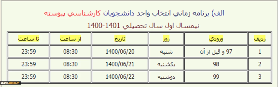 امتیاز دهید : زمان بندی انتخاب واحد دانشجویان کارشناسی نیمسال اول سال تحصیلی 1401-1400 2 شنبه 20 شهریور 1400 ساعت 10:11