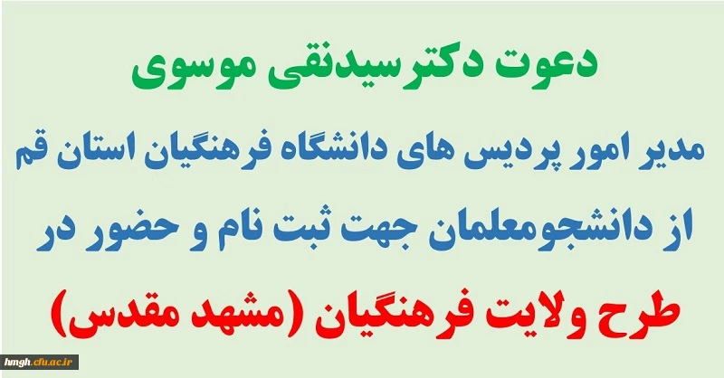 دعوت دکترسیدنقی موسوی مدیر امور پردیس های دانشگاه فرهنگیان استان قم از دانشجومعلمان جهت ثبت نام و حضور در طرح ولایت فرهنگیان (مشهد مقدس) 2