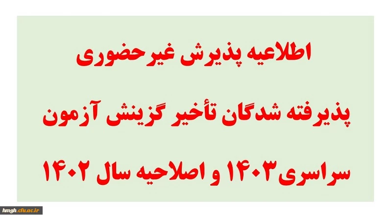 امتیاز دهید : اطلاعیه پذیرش غیر حضوری پذیرفته شدگان تأخیر گزینش آزمون سراسری1403 و اصلاحیه سال 1402 2 چهارشنبه 16 آبان 1403 ساعت 10:11