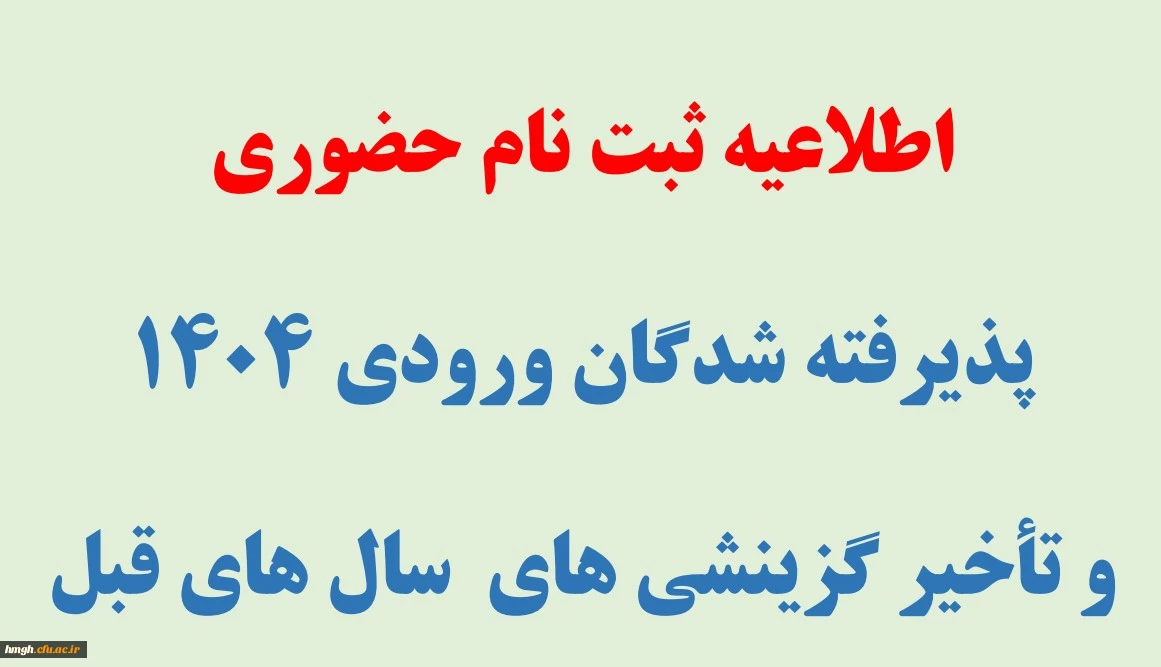 امتیاز دهید : اطلاعیه ثبت نام حضوری پذیرفته شدگان ورودی مهر1404 و تاخیر گزینشی های سال های قبل 2 شنبه 5 مهر 1404 ساعت 11:52